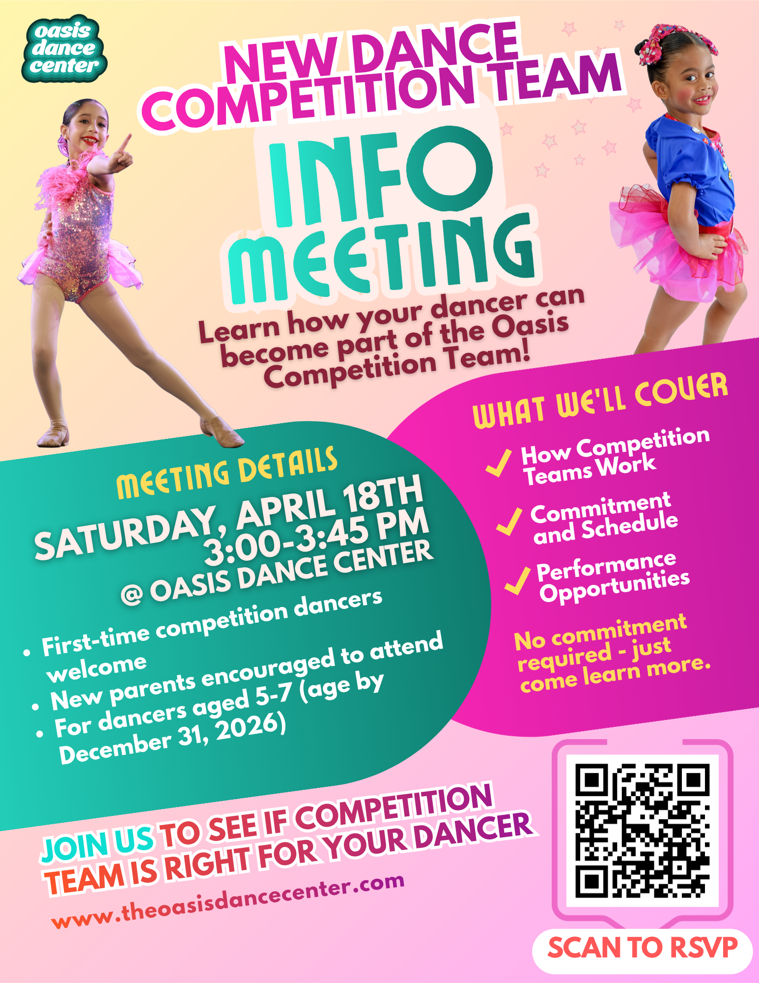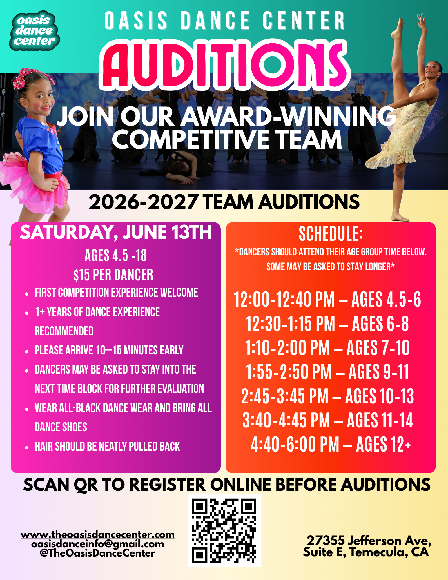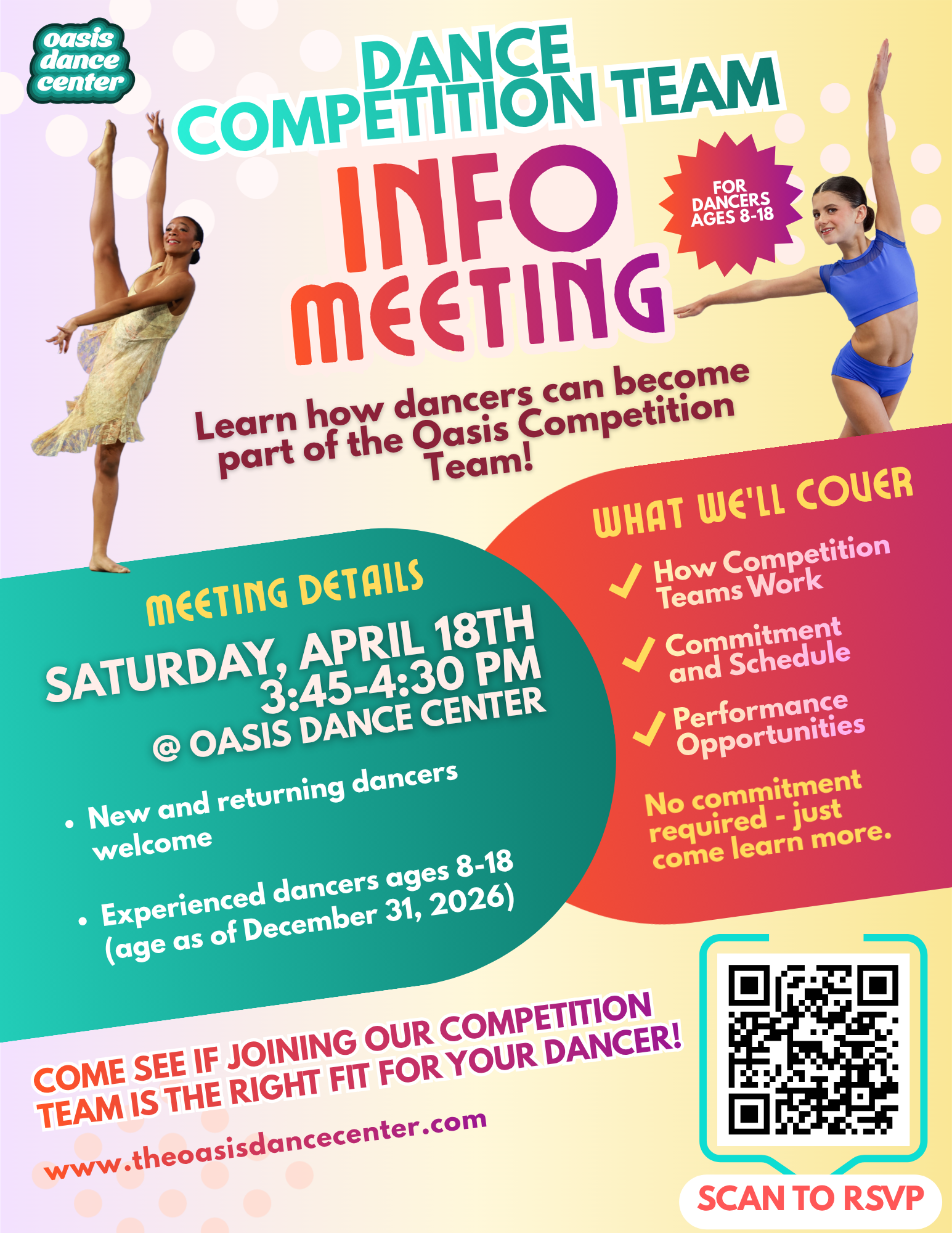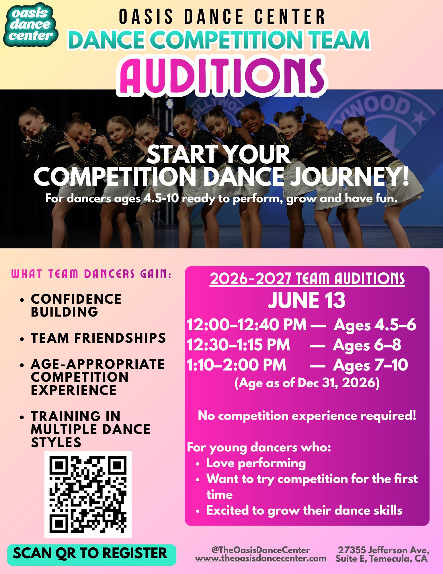At Oasis Dance Center, our dancers inspire everything we do. We are proud to nurture talented performers of all ages and levels in a supportive, uplifting environment where passion, dedication, and growth take center stage. Whether you're just beginning or ready to take your training further, there’s a place for you at Oasis.